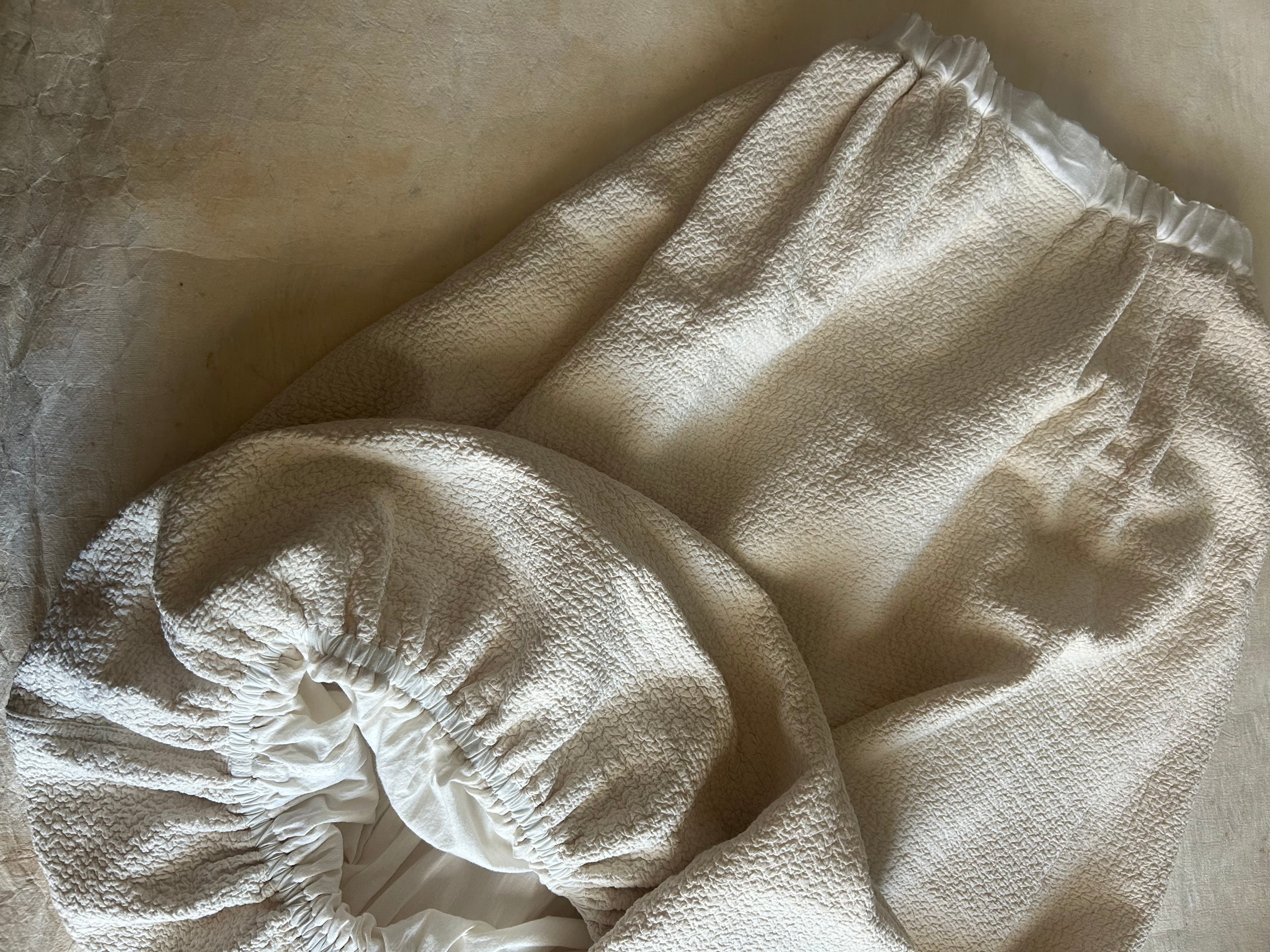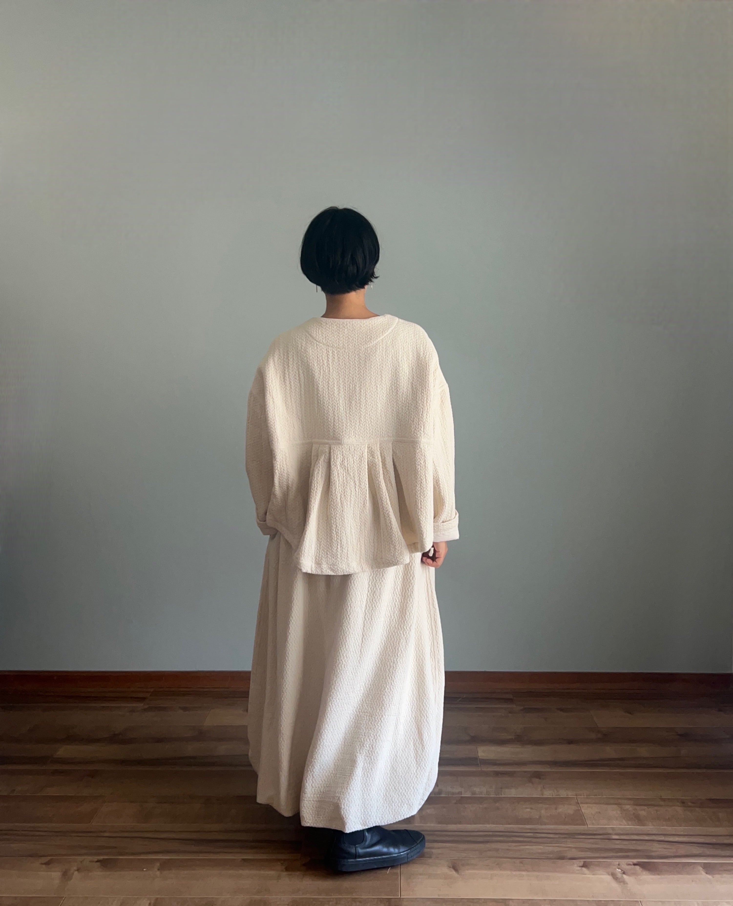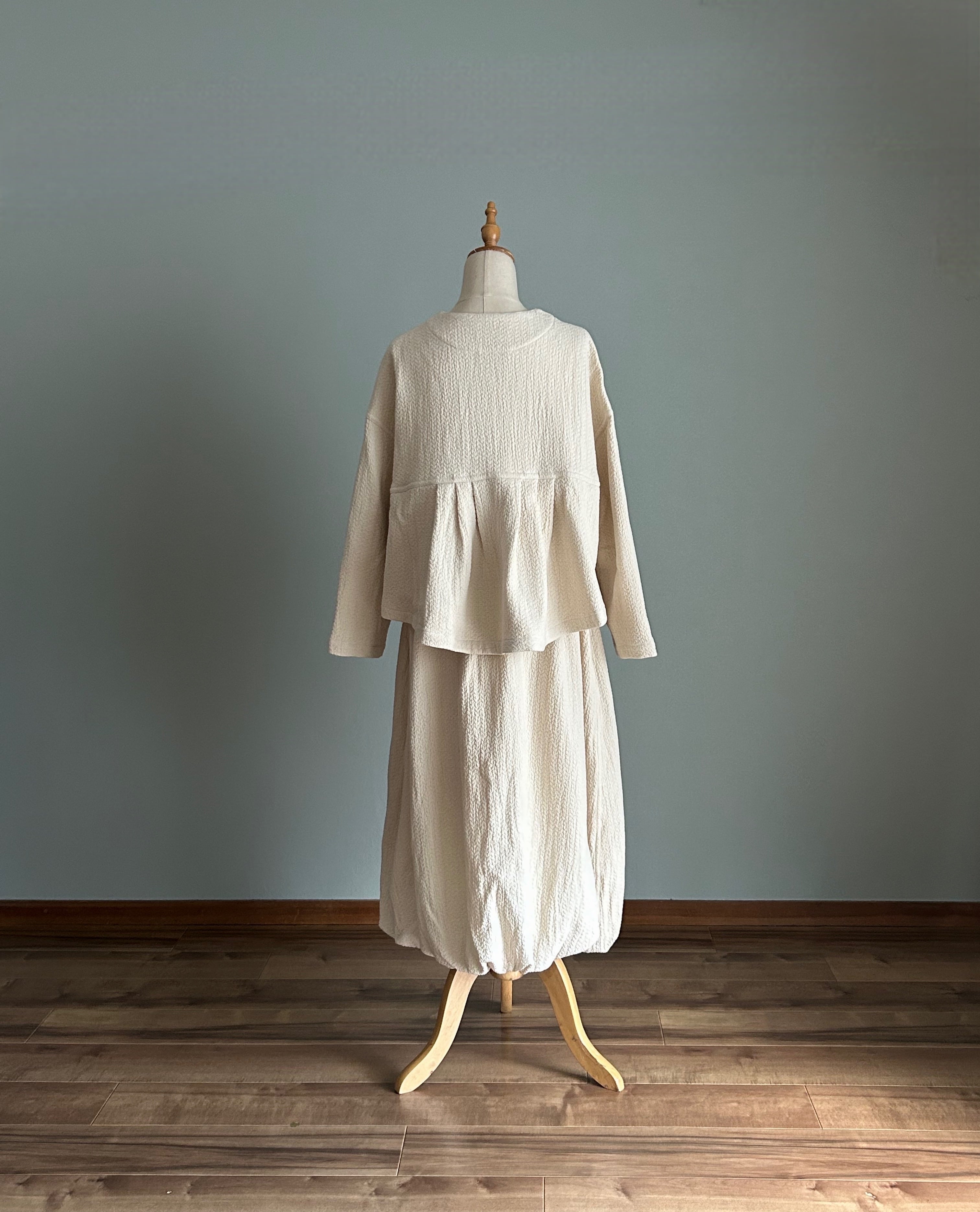 コットンバルーンスカートは、表地はポコポコしたサッカー生地のコットンを使用し、裏地もさらりとした肌触りのローンコットンを使用しています。空気を含むことで暖かさと快適さを兼ね備えています。シンプルながらも、バルーンシルエットが特徴的で、カジュアルな日常使いから特別なシーンまで幅広く活躍します。どんなトップスとも相性抜群で、コーディネートの幅を広げてくれます。