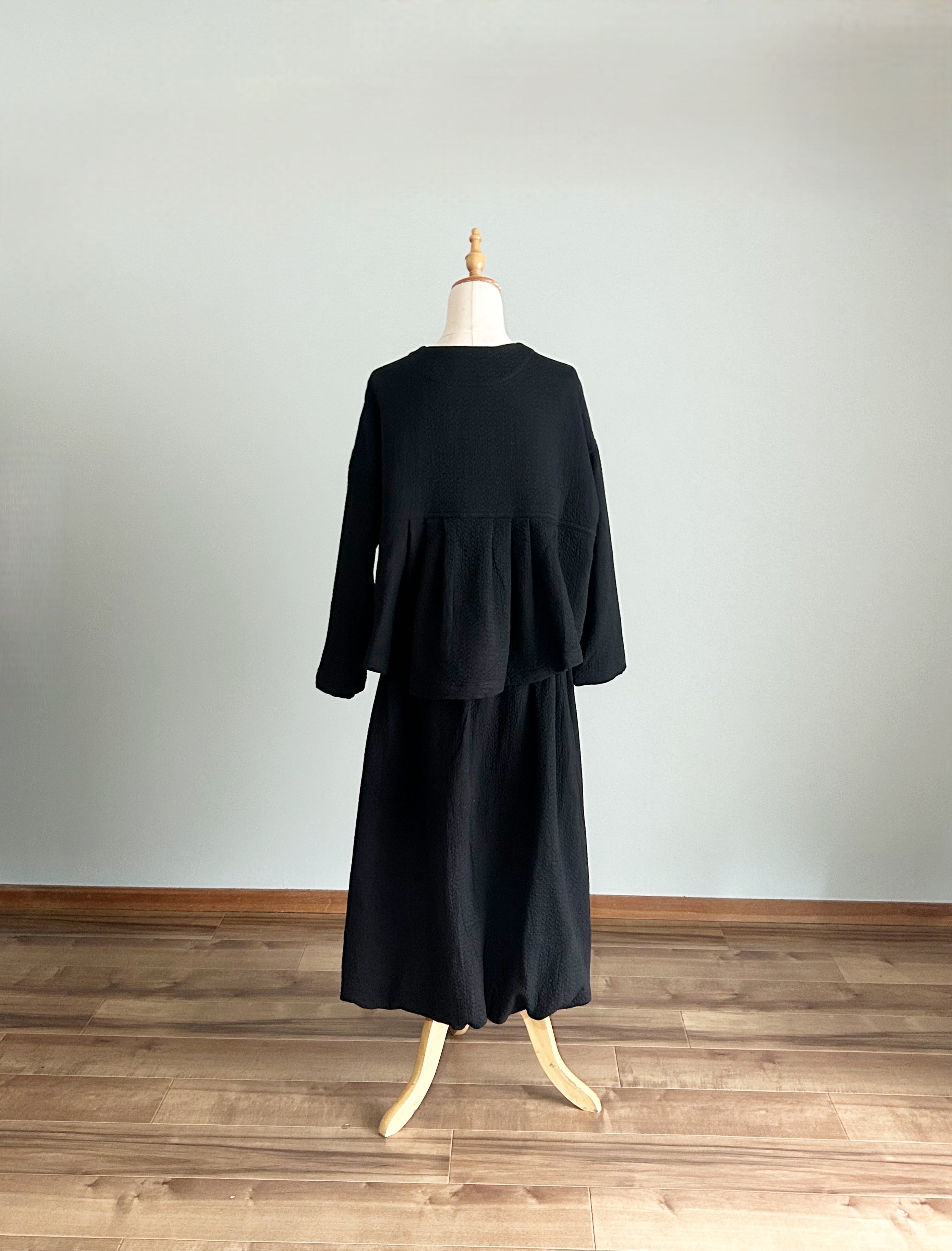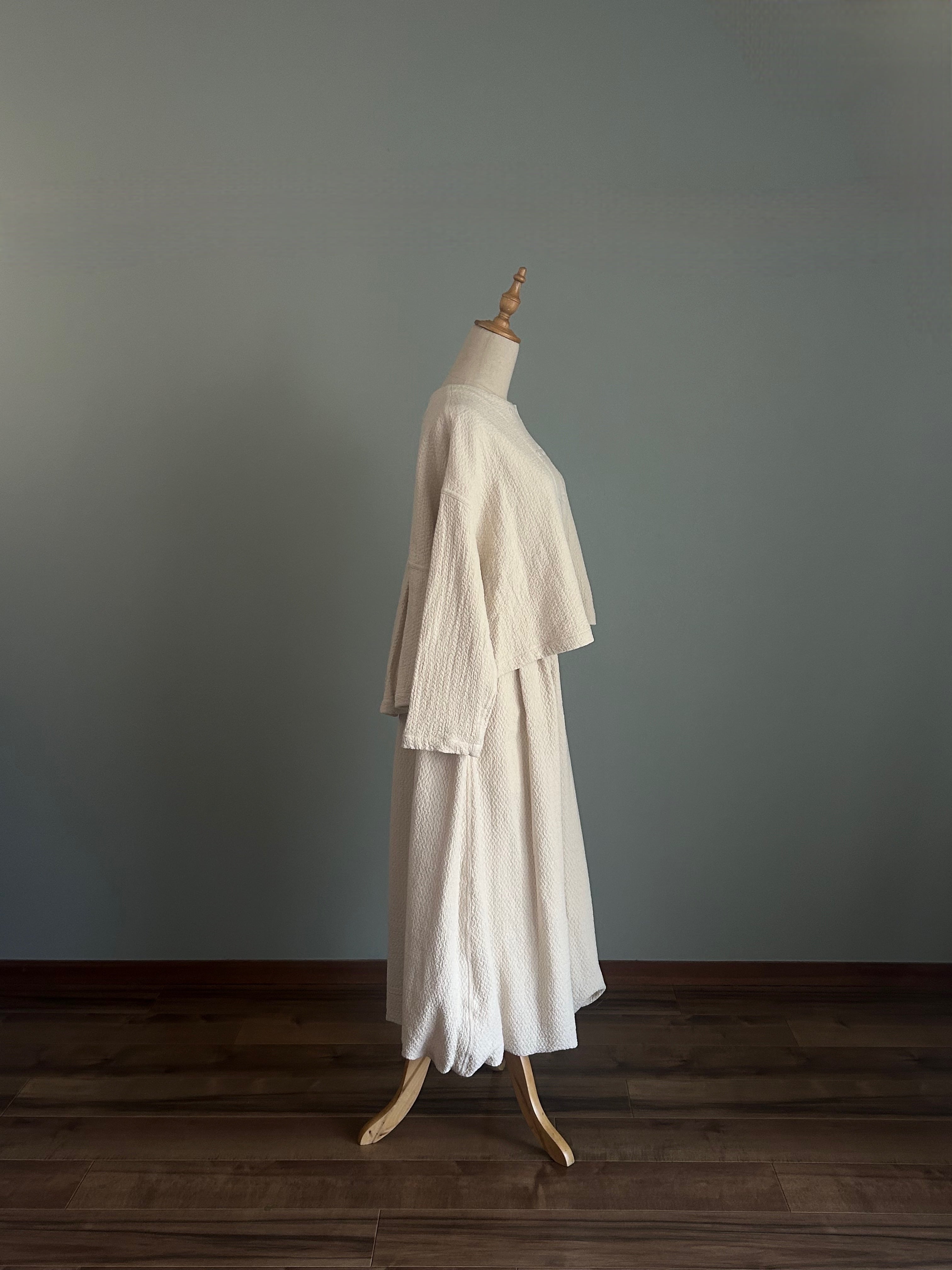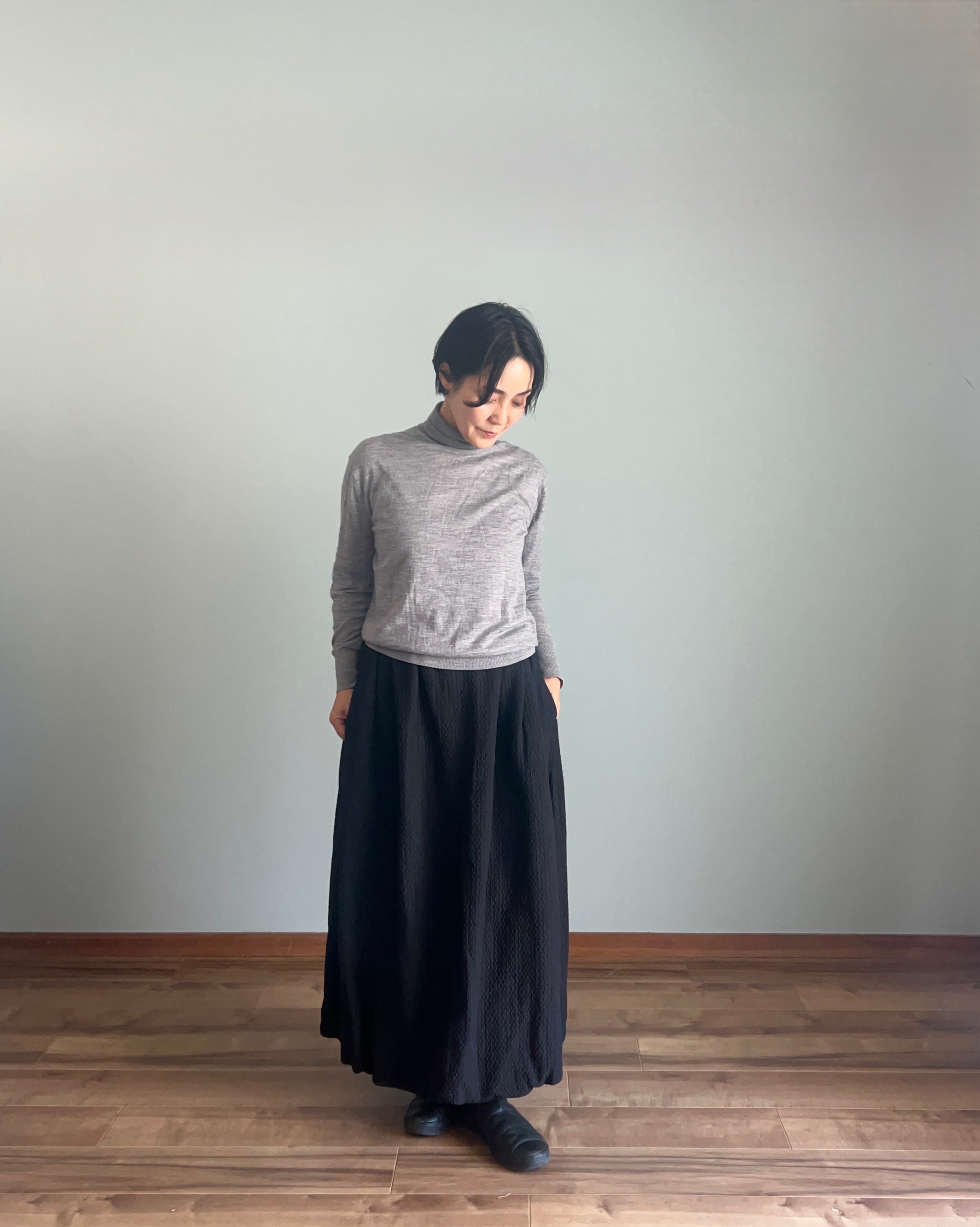 コットンバルーンスカートは、表地はポコポコしたサッカー生地のコットンを使用し、裏地もさらりとした肌触りのローンコットンを使用しています。空気を含むことで暖かさと快適さを兼ね備えています。シンプルながらも、バルーンシルエットが特徴的で、カジュアルな日常使いから特別なシーンまで幅広く活躍します。どんなトップスとも相性抜群で、コーディネートの幅を広げてくれます。