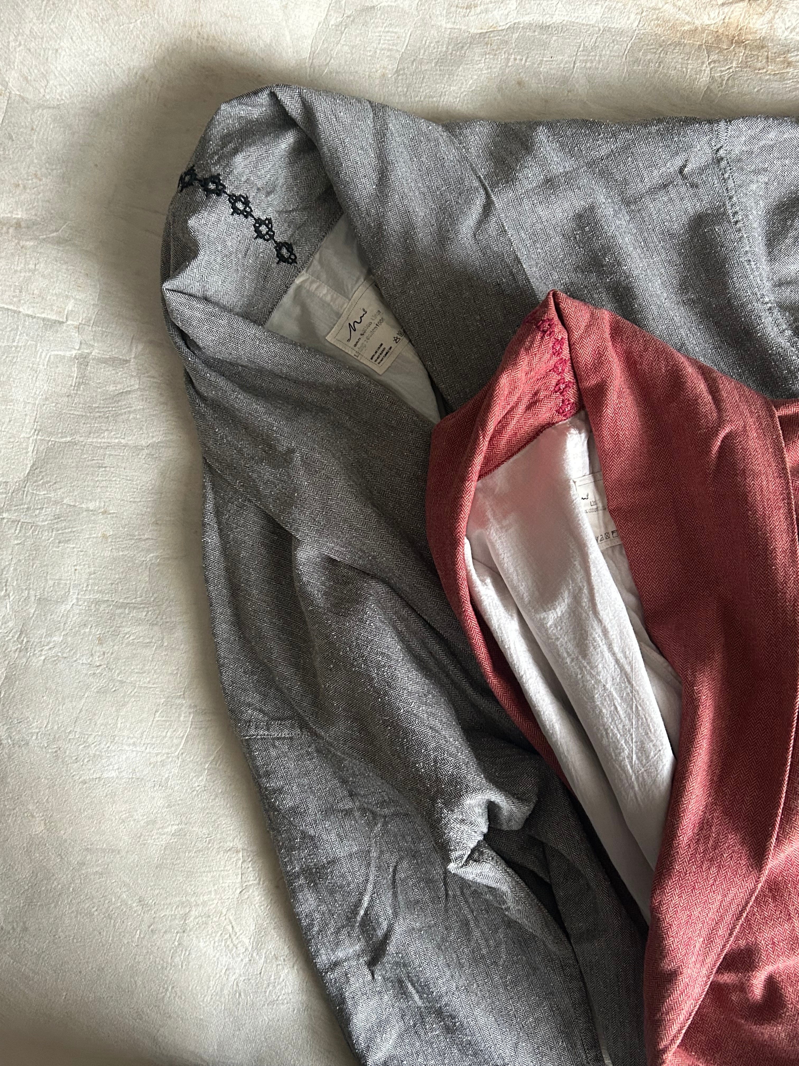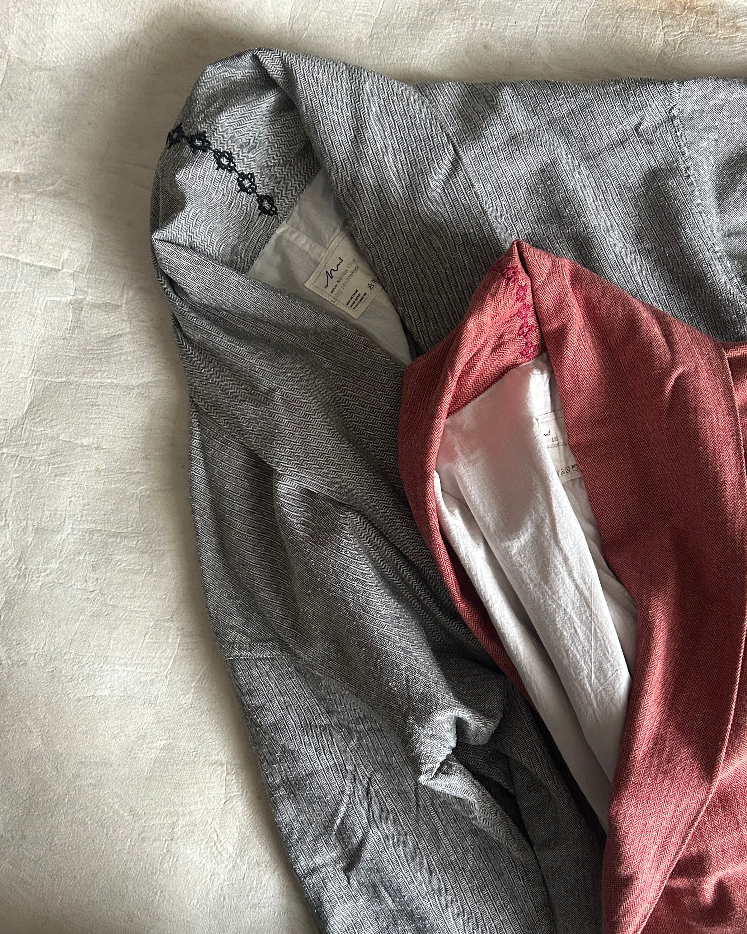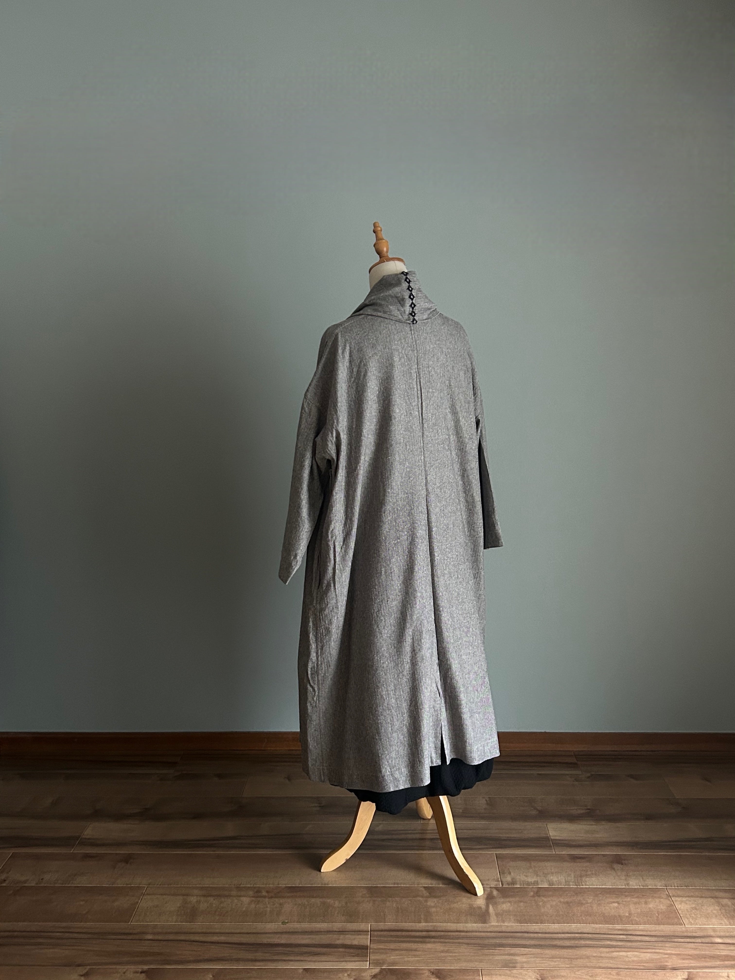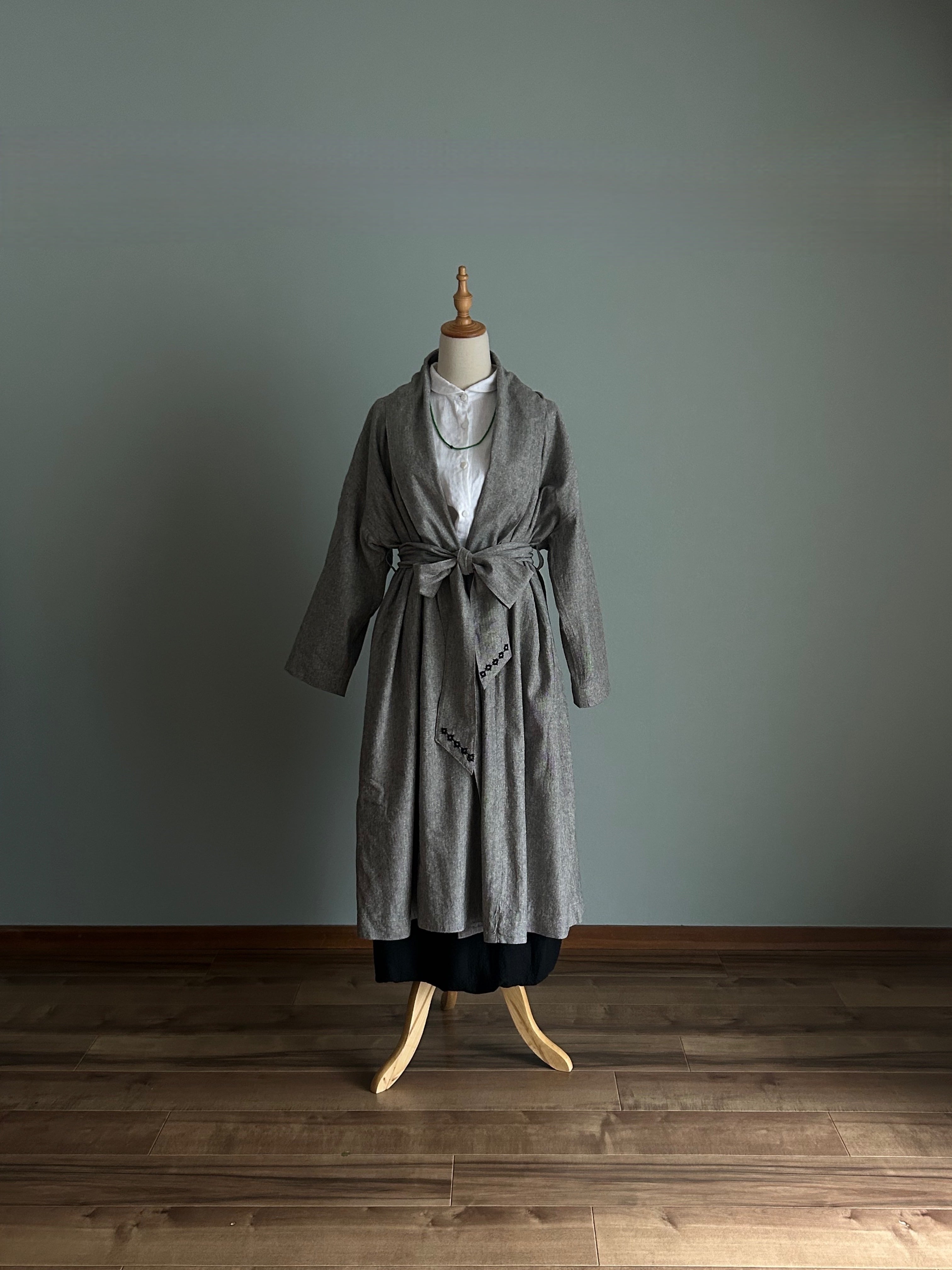 このHerring Bone Robe Coatは、表地にリネンコットンを使用し、軽やかでありながらしっかりとした質感があります。裏地には優れた肌触りのローンコットンを施し、快適な着用感が魅力です。特徴的なヘリンボーン柄が、シンプルなコーディネートに華やかさをプラスしてくれます。赤と黒の色展開は、どんなシーンにも合わせやすく、日常使いから特別なイベントまで幅広く活躍します。