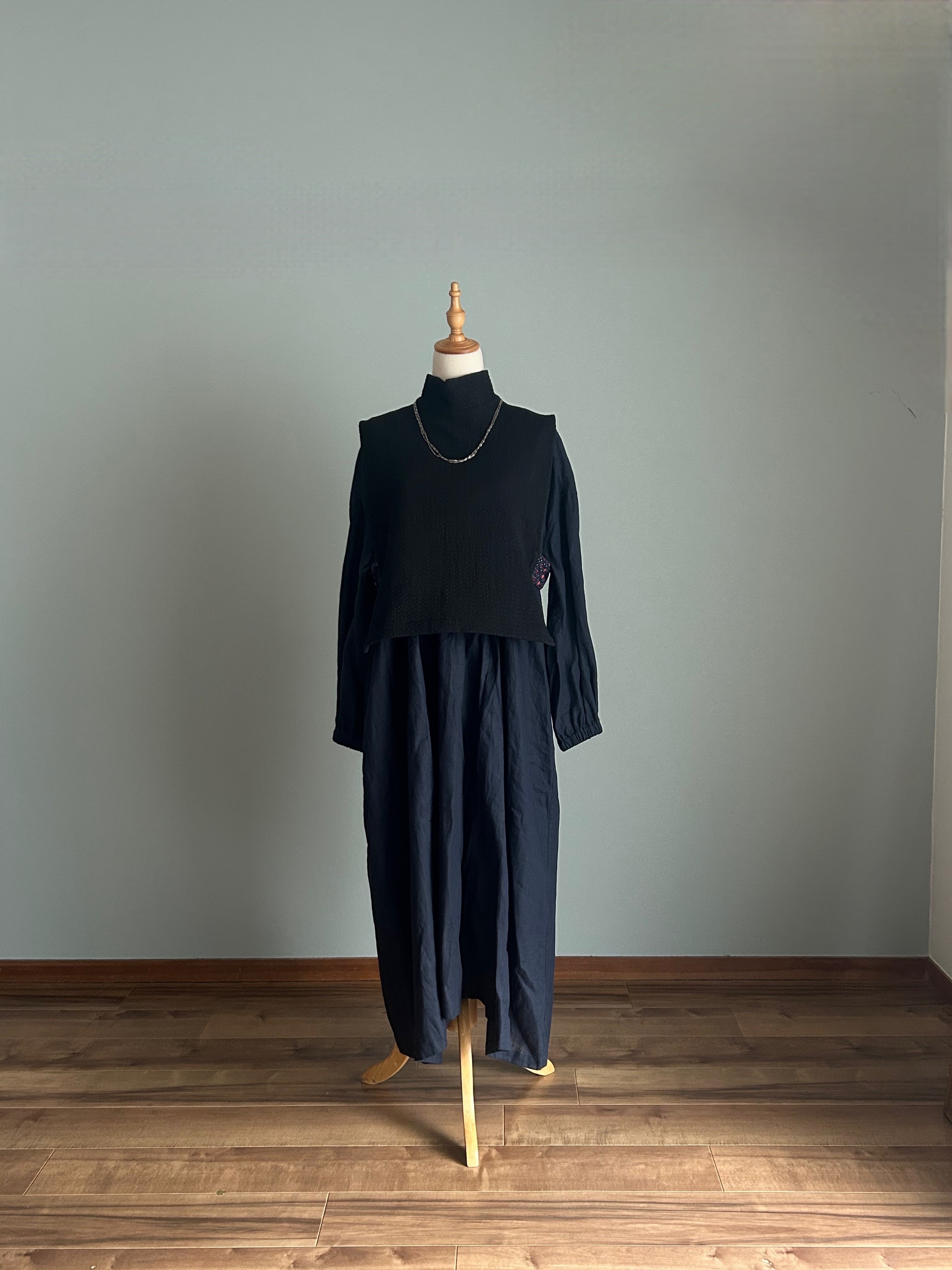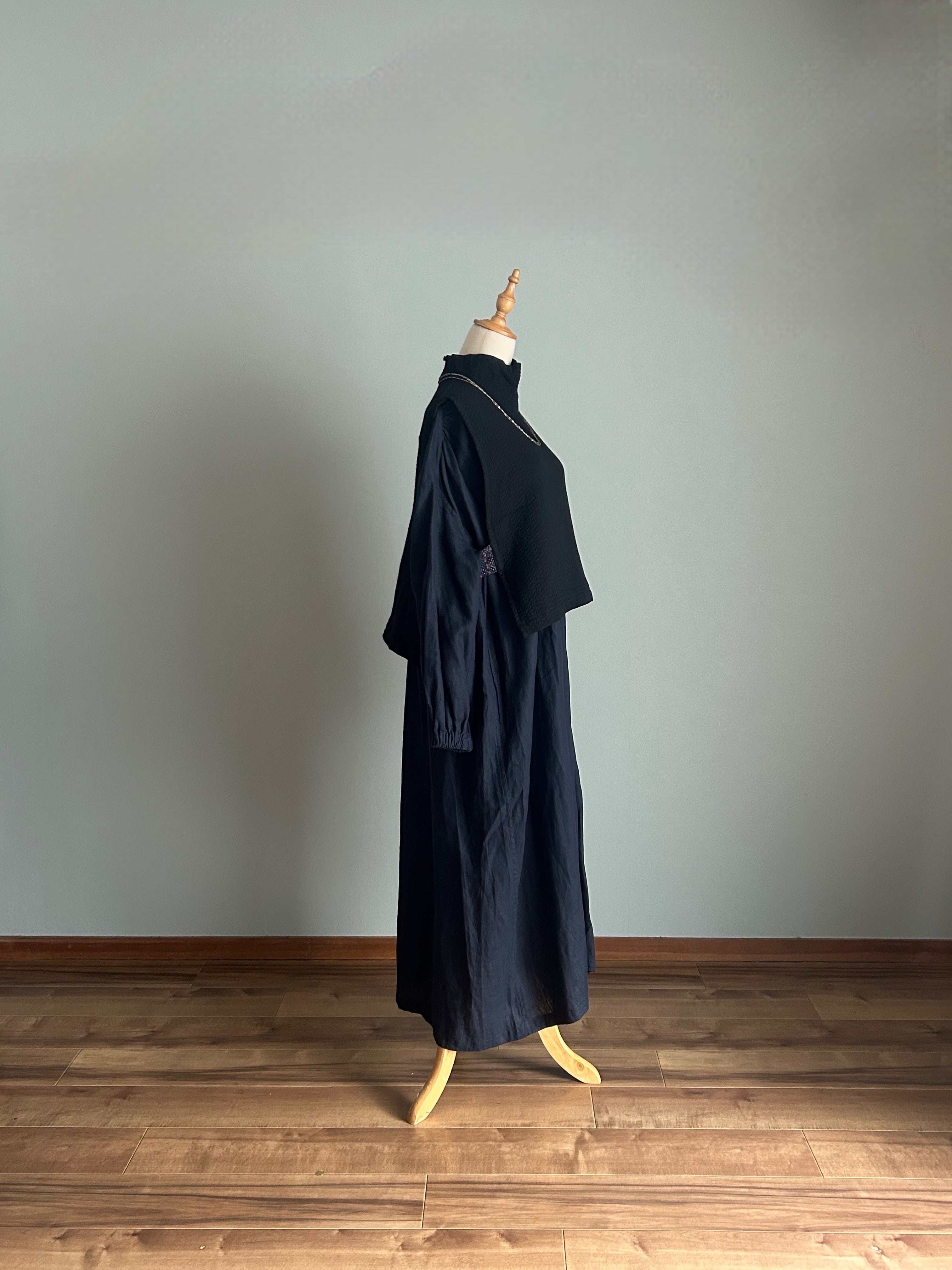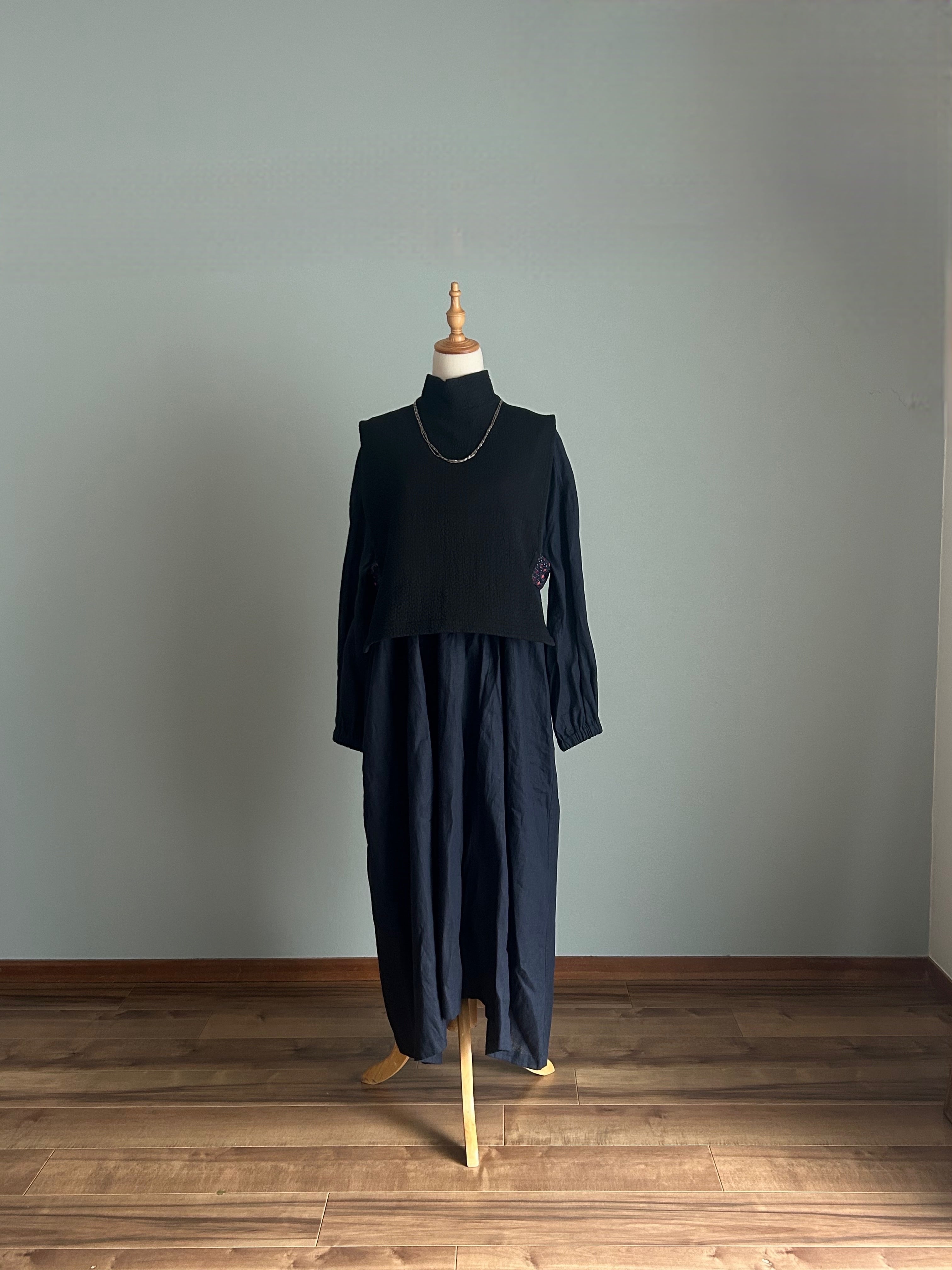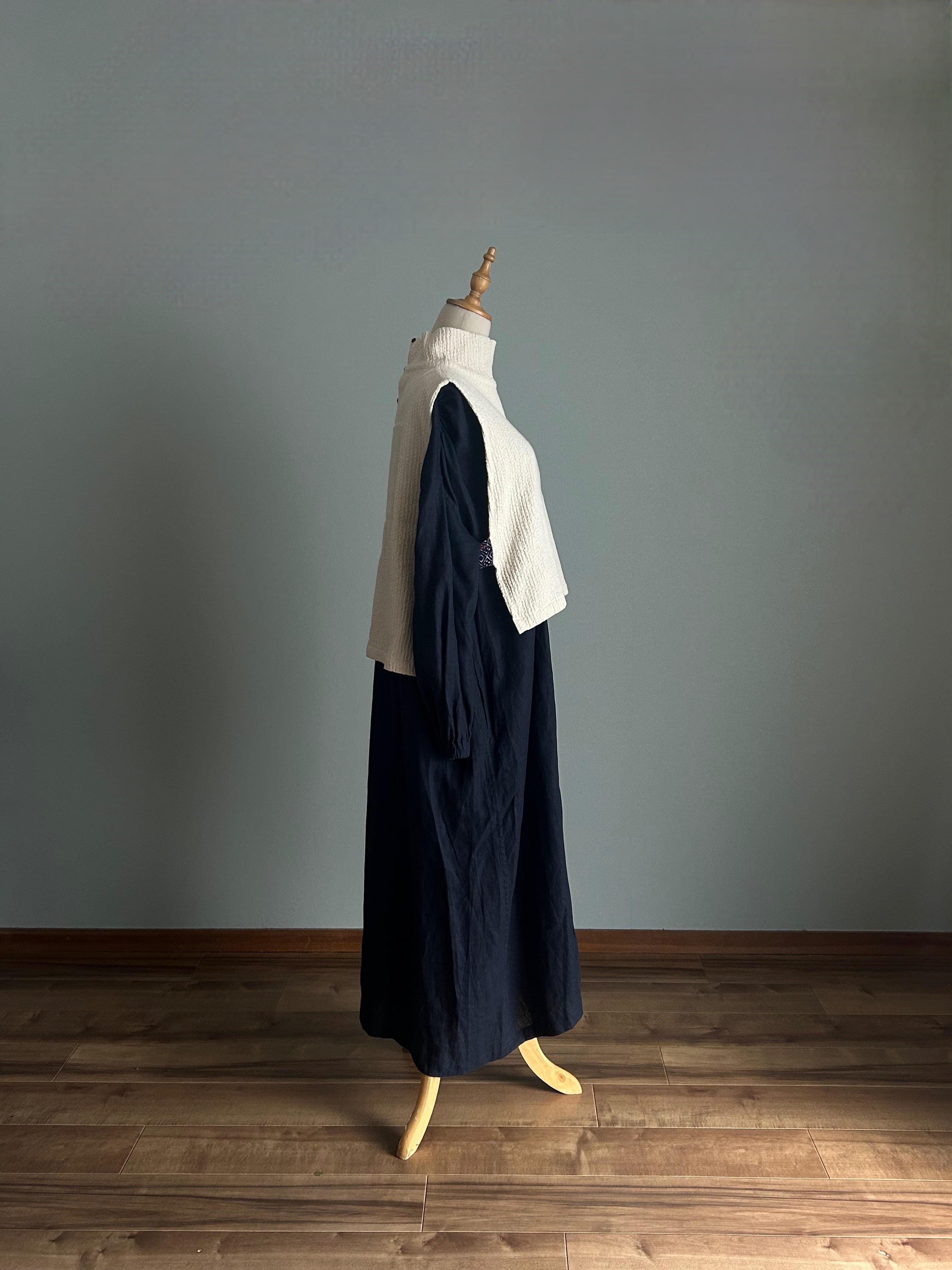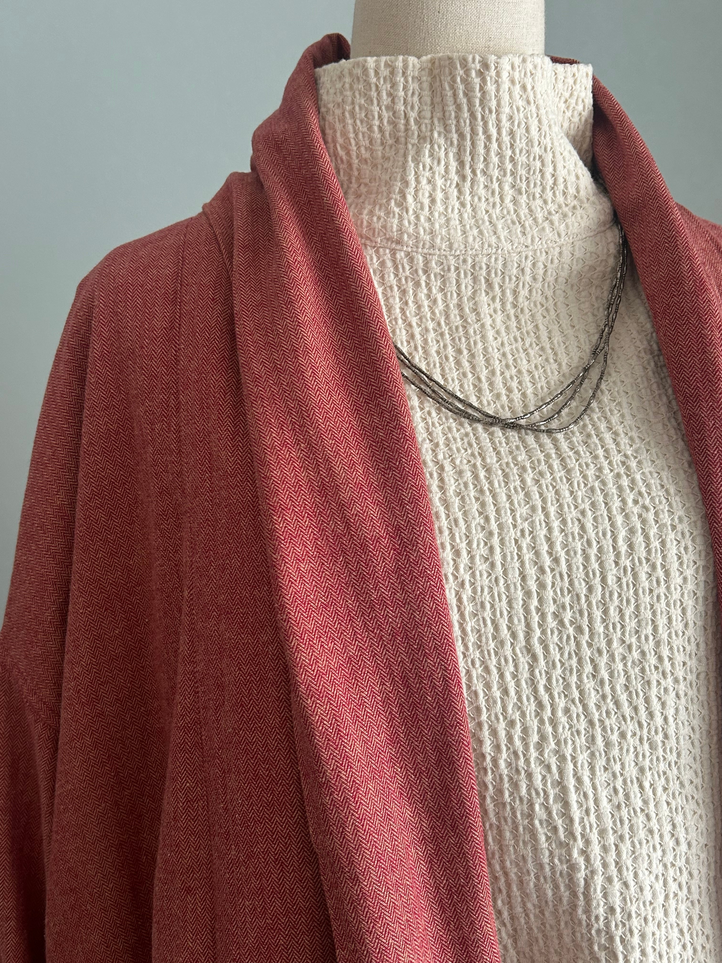 前見頃を短くすることで、中にセーター、ワンピース、スカート、パンツと色んなコーディネートに合わせやすくしております。