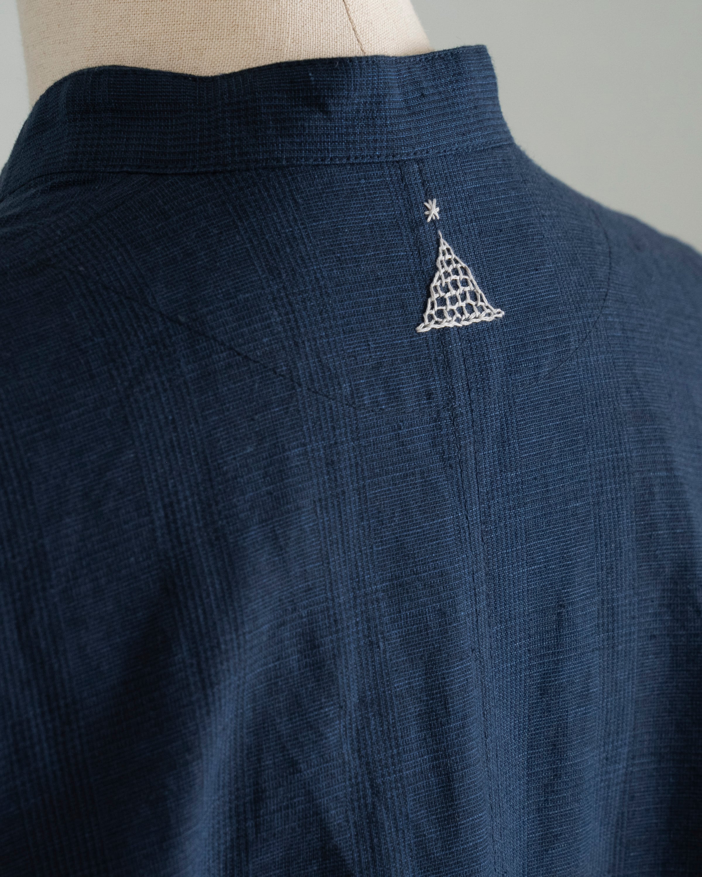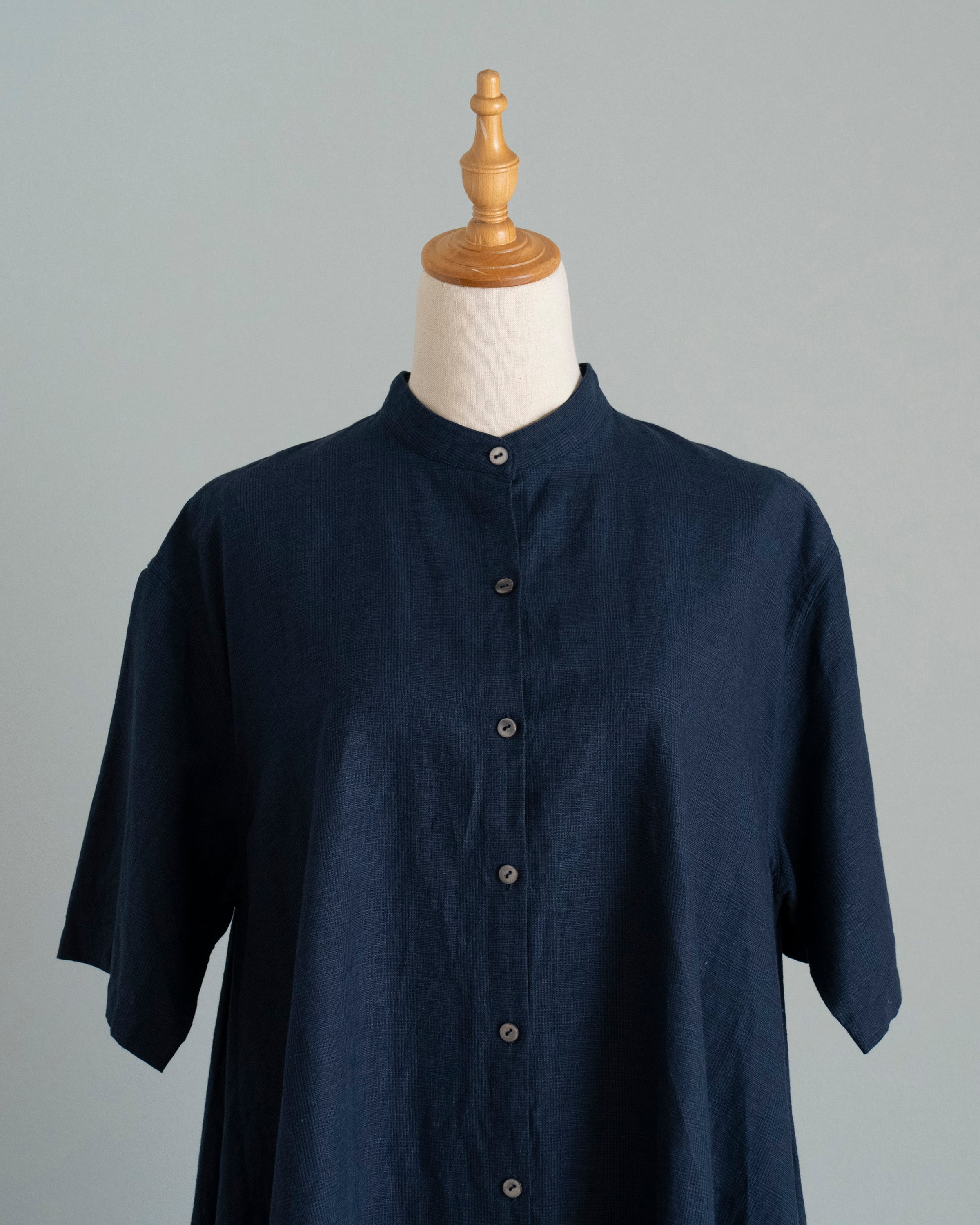 深いネイビーの織り柄が印象的な、スタンドカラーのシャツワンピース。