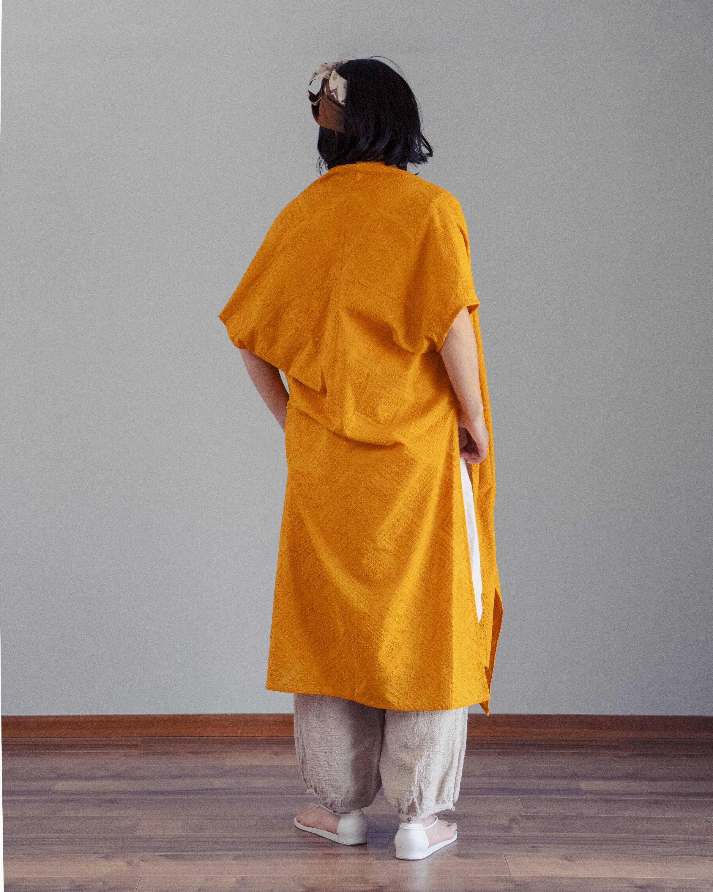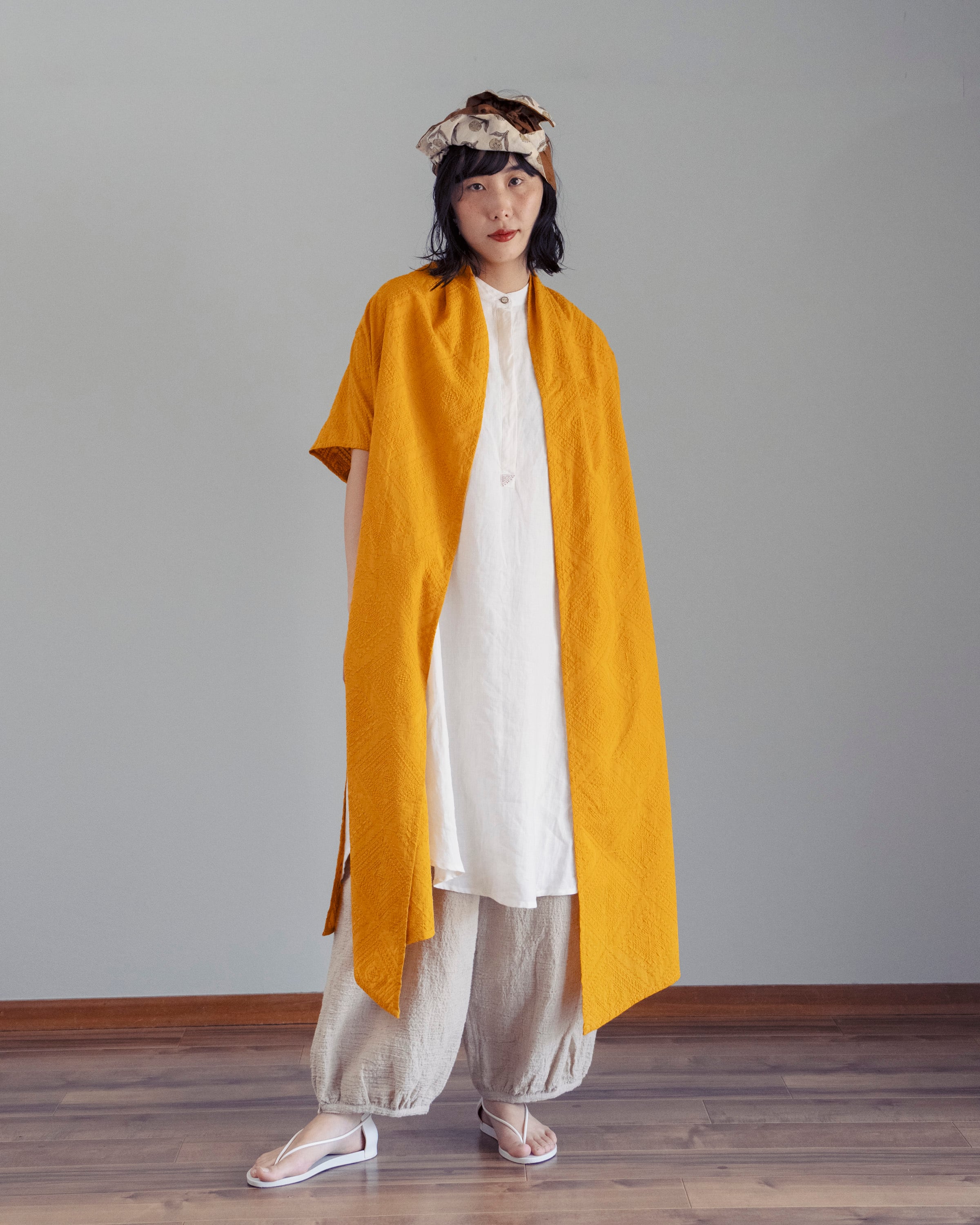 表情のある刺繍コットン生地で仕立てた、さらりと羽織れるロングジレ。