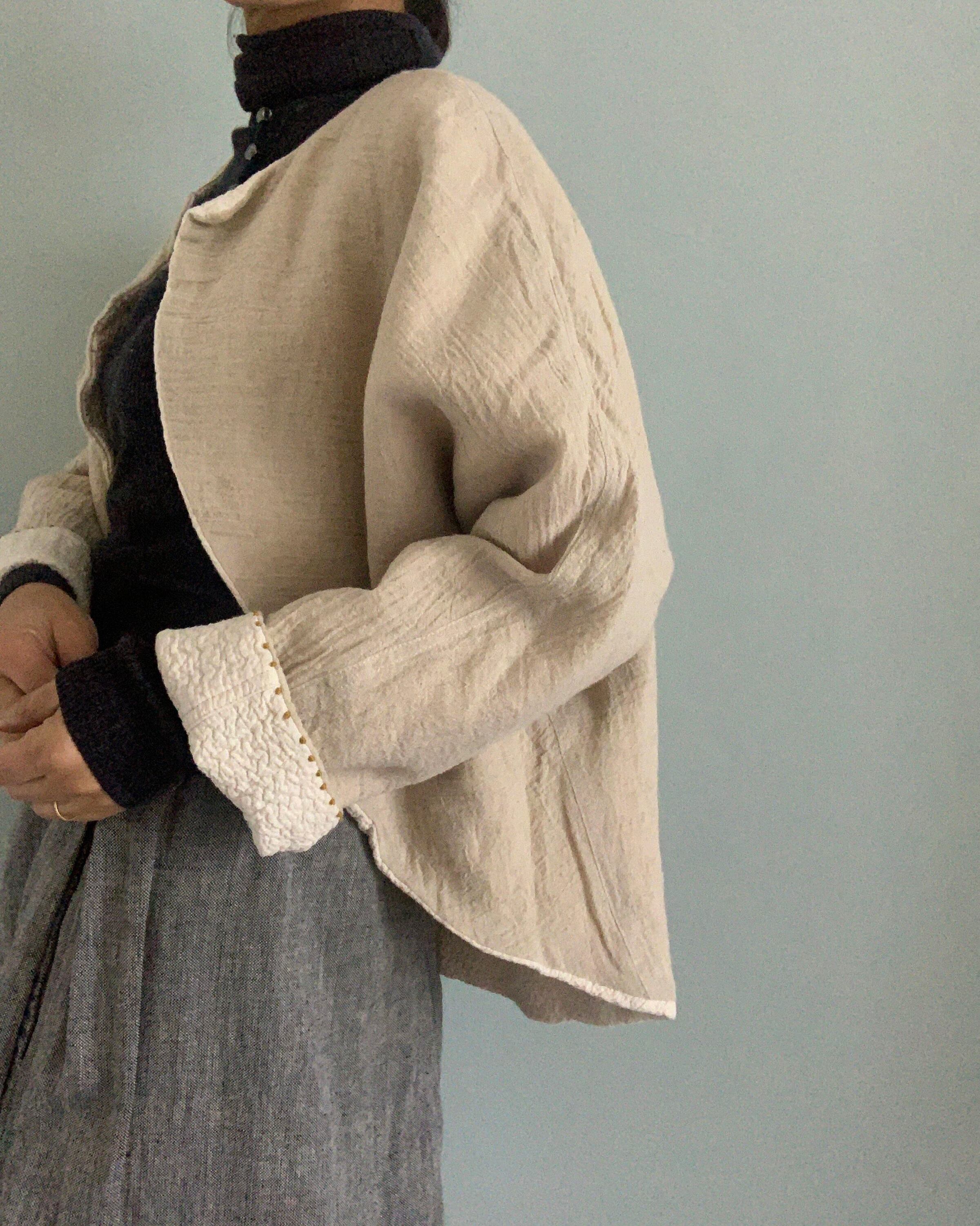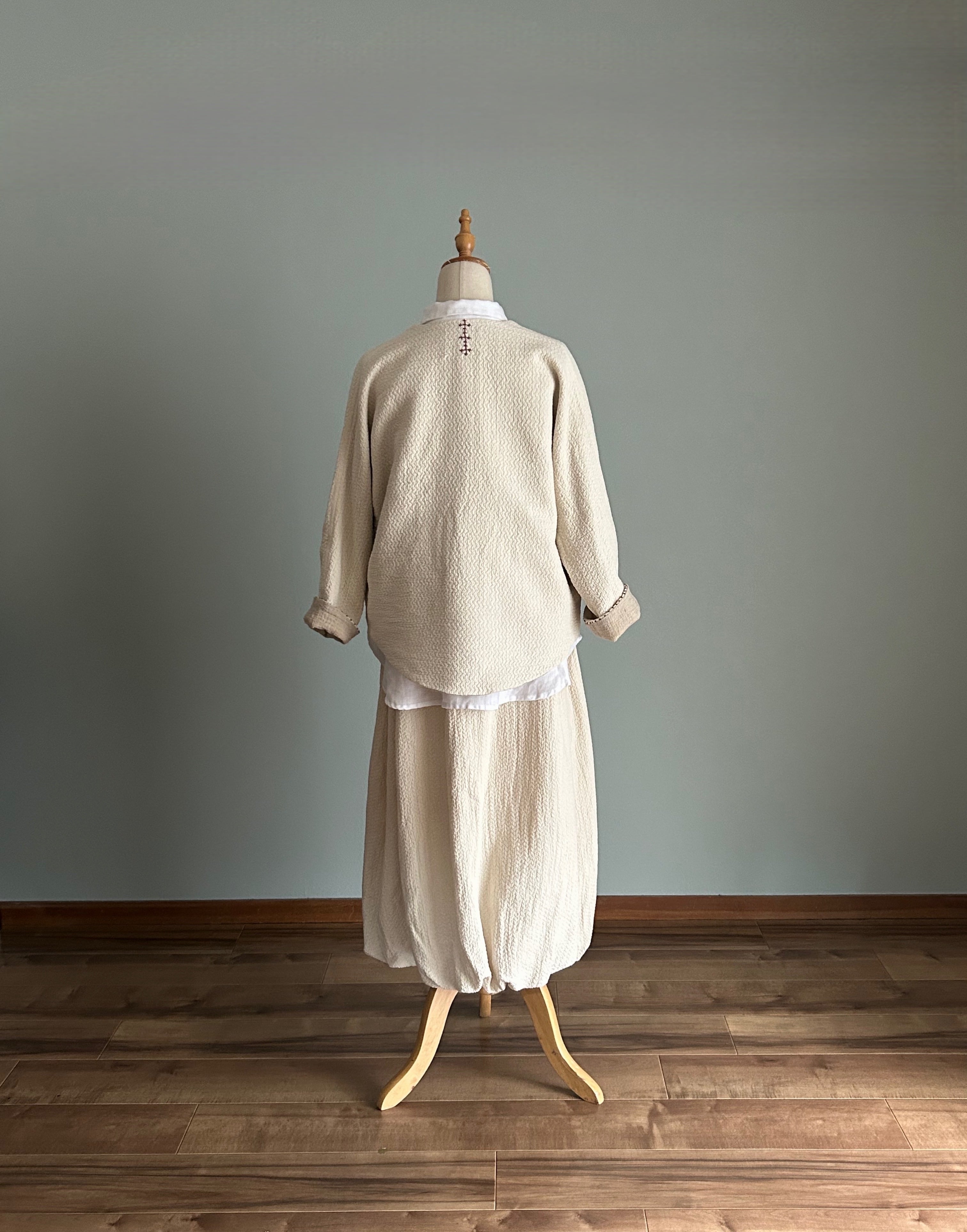 ワッシャーコットンガーゼ生地とリネンガーゼ生地のリバーシブルで袖を通すととても暖か。