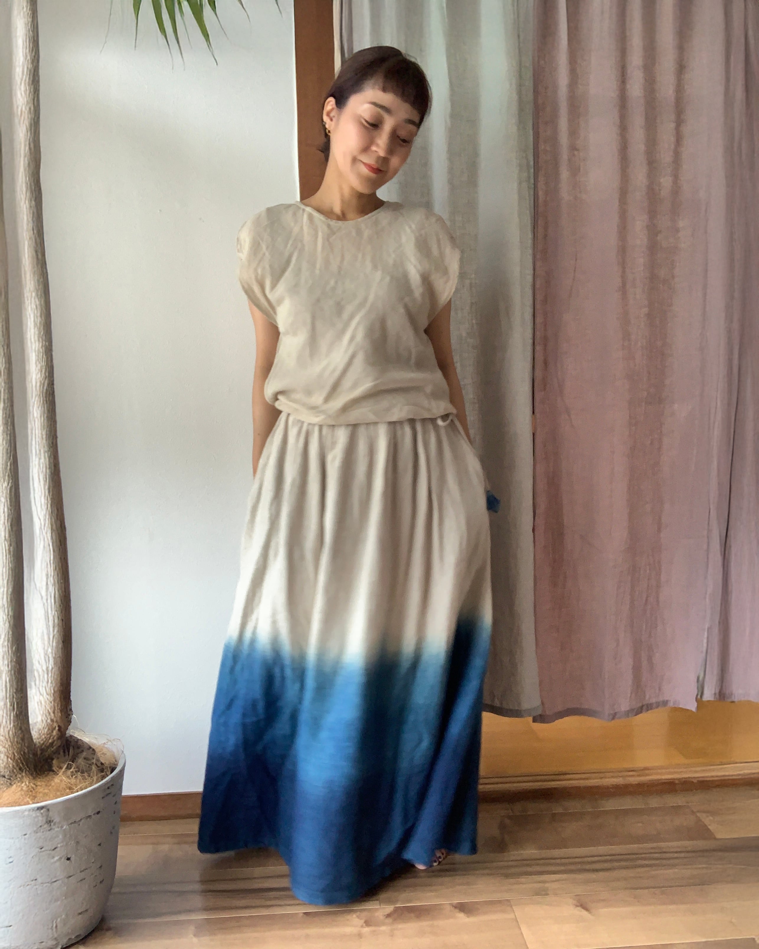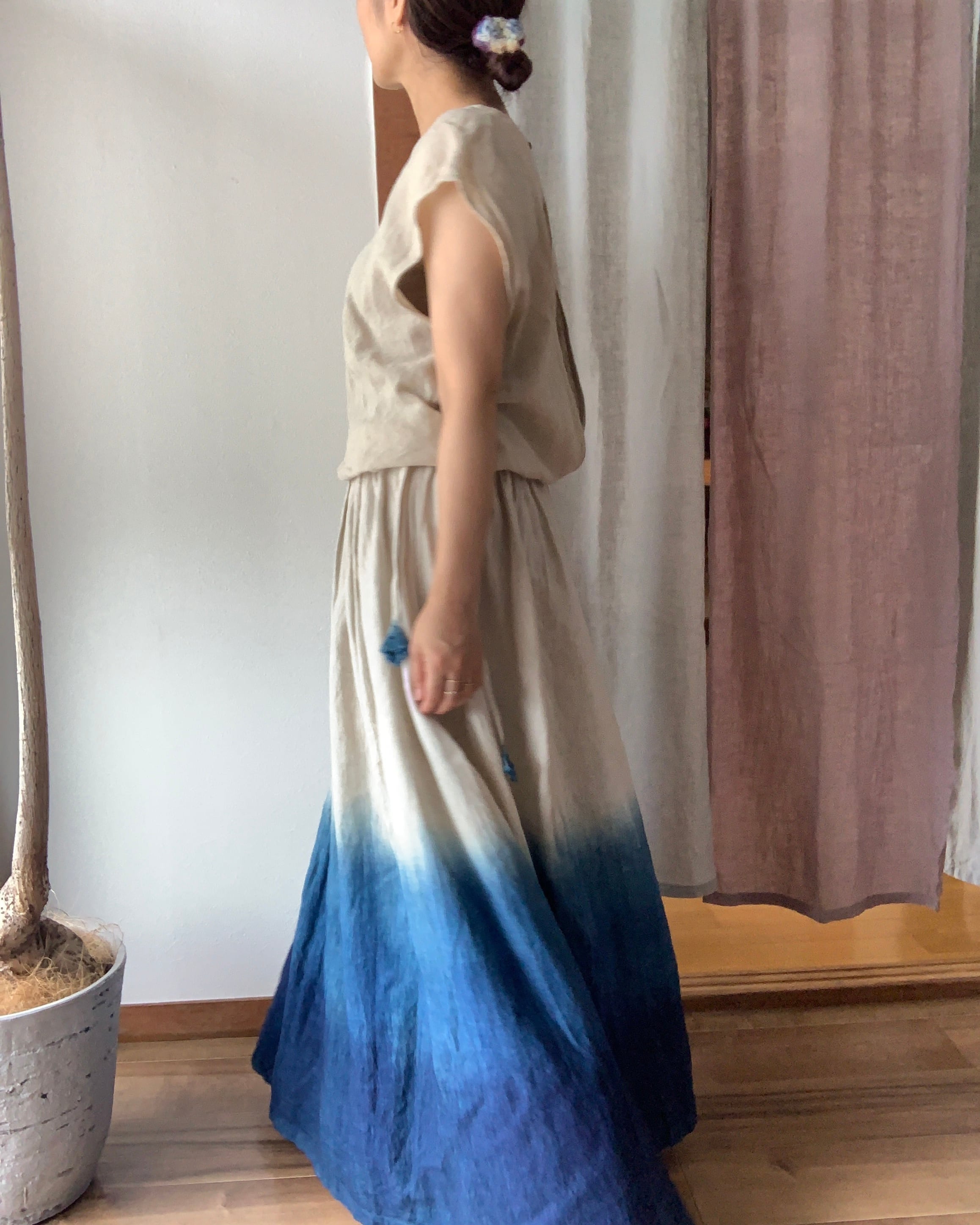 トップスにリネンガーゼ生地、ボトムの生地は中厚リネンでお作りしております。